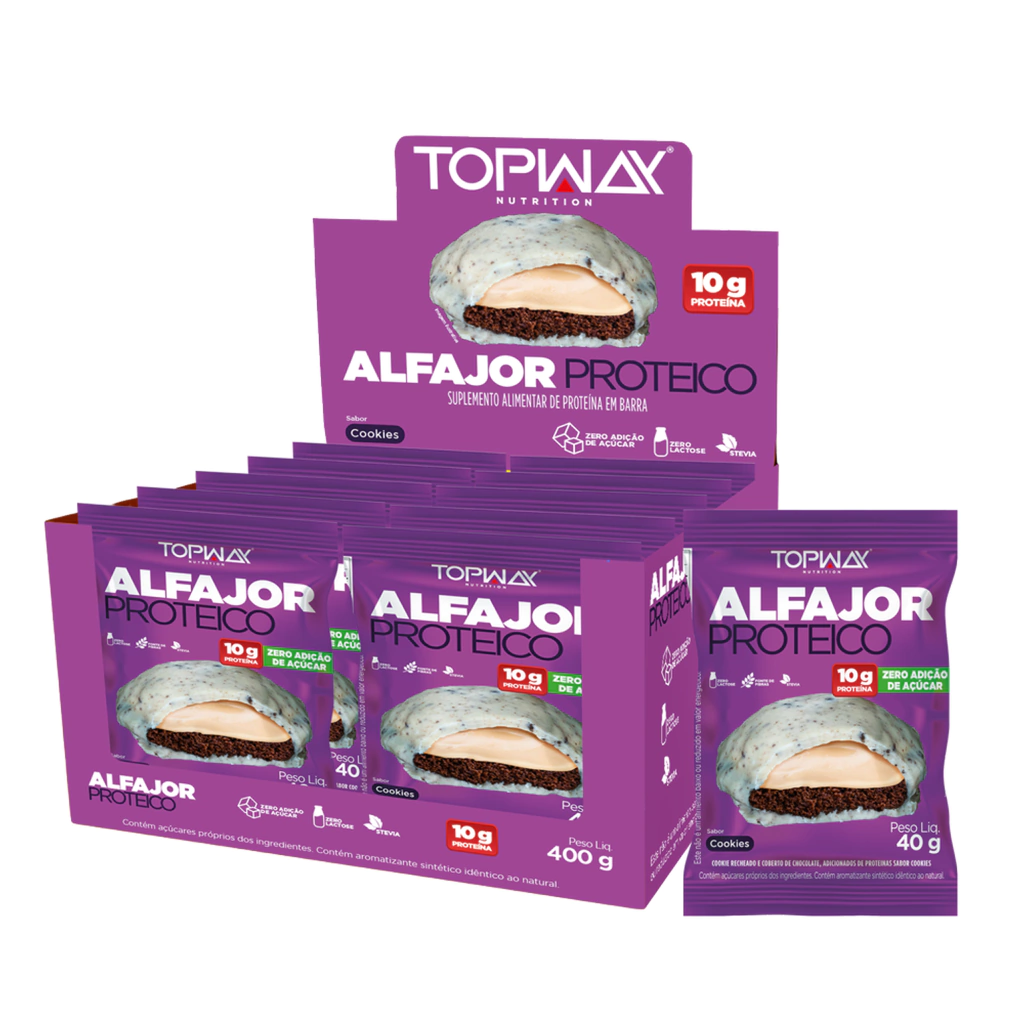 O Alfajor Proteico Topway une o sabor delicioso de um alfajor com os benefícios de um suplemento proteico. Formulado com 10g de proteína por unidade, zero adição de açúcares, zero glúten e sem lactose, é adoçado com stevia, proporcionando uma opção gostosa e saudável para diversos momentos do seu dia.