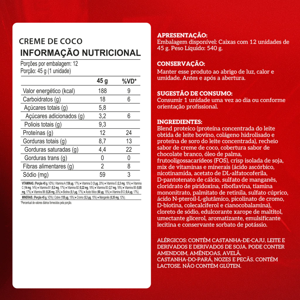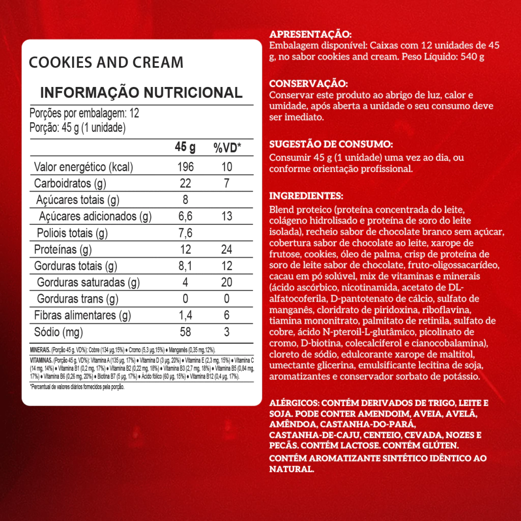 Por ser uma barra de proteína completa, com proteínas, gorduras essenciais e aminoácidos, sua ingestão aumenta a saciedade entre as refeições, diminuindo a vontade de comer doces e alimentos calóricos.