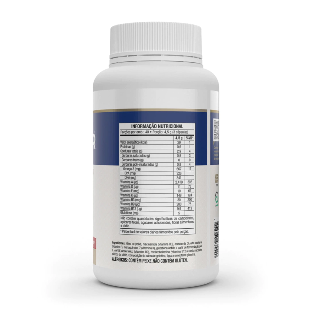 OMEGAFOR® VITAMINS - 120 cápsulas - Vitafor Suplemento alimentar de óleo de peixe, fonte de ômega 3, 7 vitaminas (A, D, E, K, B3, B9 e B12) e Glutationa.