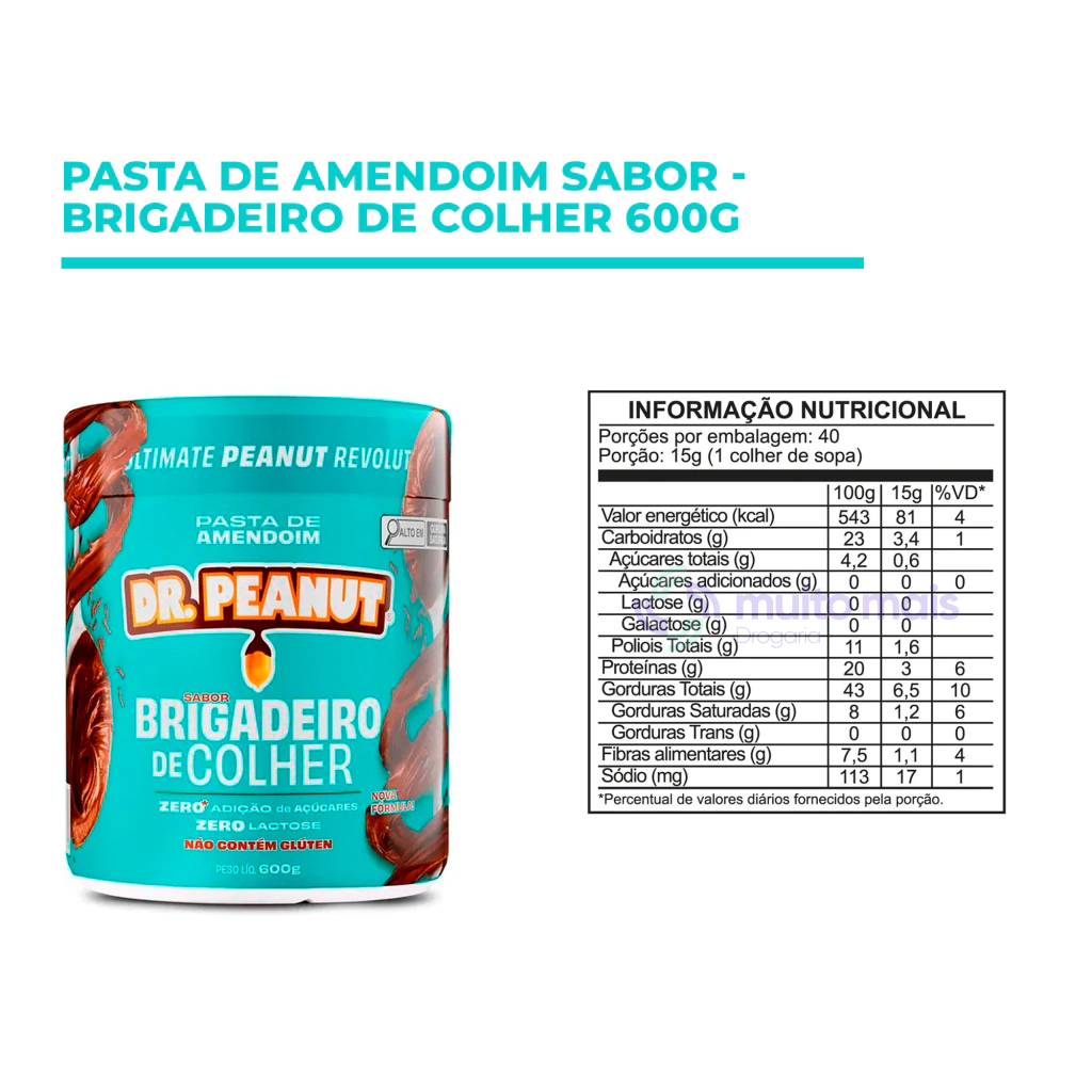 Ingredientes: Amendoim torrado, creme sabor chocolate brigadeiro (óleo vegetal, leite em pó integral, gordura vegetal, cacau em pó, estabilizante maltitol, emulsificante poliglicerol poliricinoleato, aroma idêntico ao natural), whey protein sabor chocolate, enzima lactase, sal e edulcorantes: xilitol, sucralose e acessulfame de potássio.
