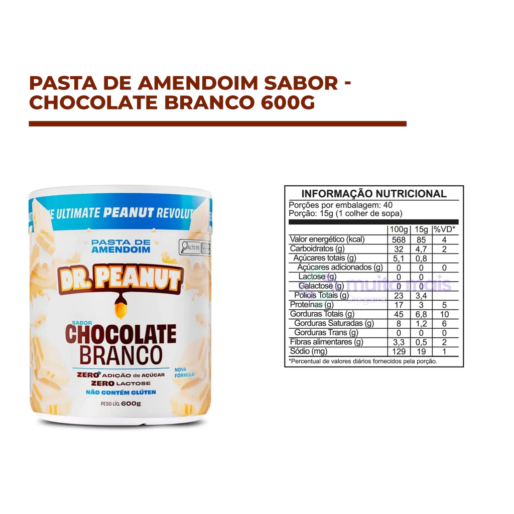 Desfrute do luxo saudável que é a Pasta de Amendoim Sabor Chocolate Branco da Dr. Peanut e transforme cada refeição ou lanche em um momento especial de prazer e saúde