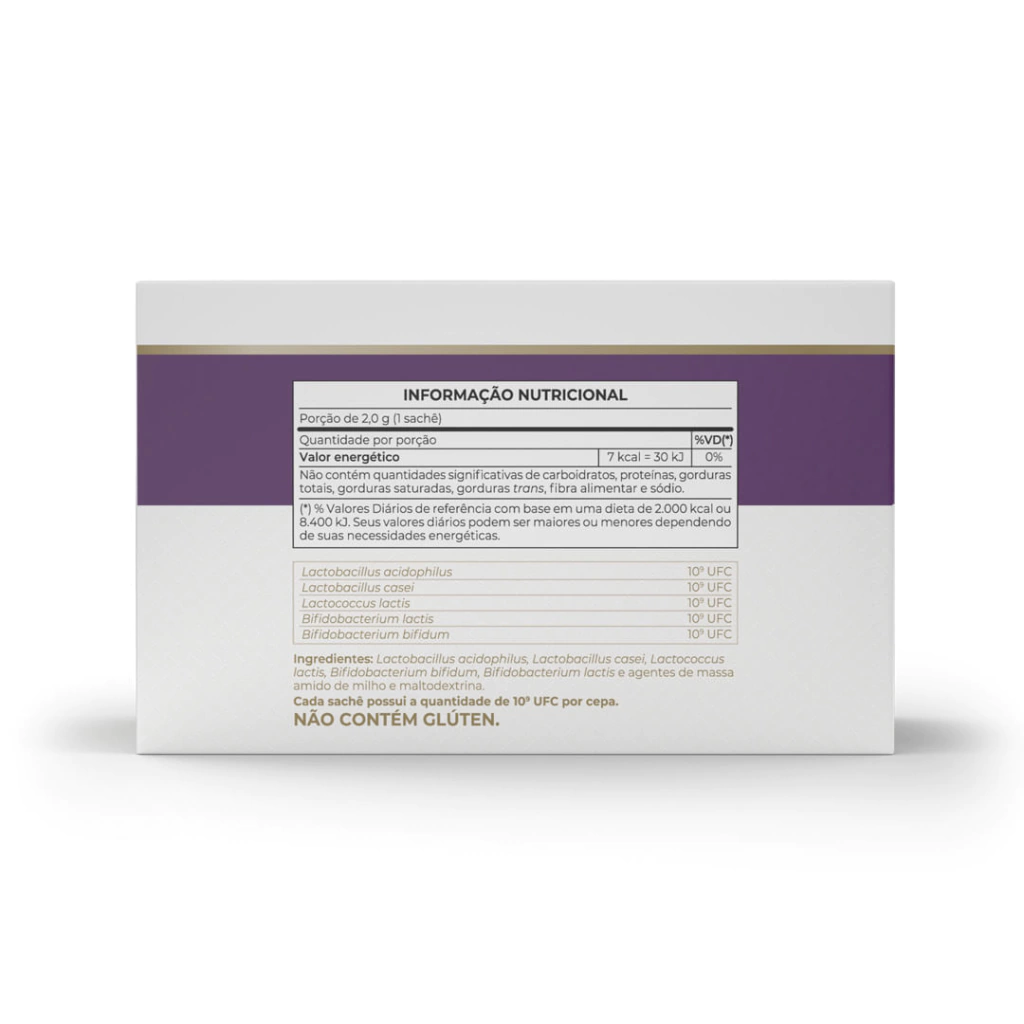 Lactobacillus acidophilus, Lactobacillus casei, Lactococcus lactis, Bifidobacterium bifidum, Bifidobacterium lactis e agentes de massa amido de milho e maltodextrina.