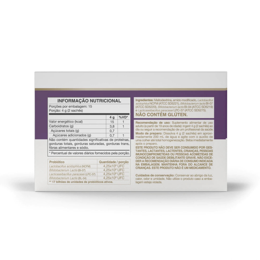 Maltodextrina, amido modificado, Lactobacillus acidophilus NCFM (ATCC SD5221), Bifidobacterium lactis BI-07 (ATCC SD5220), Bifidobacterium lactis BL-04 (ATCC SD5219) e Lacticaseibacillus paracasei Lpc-37 (ATCC SD5275).