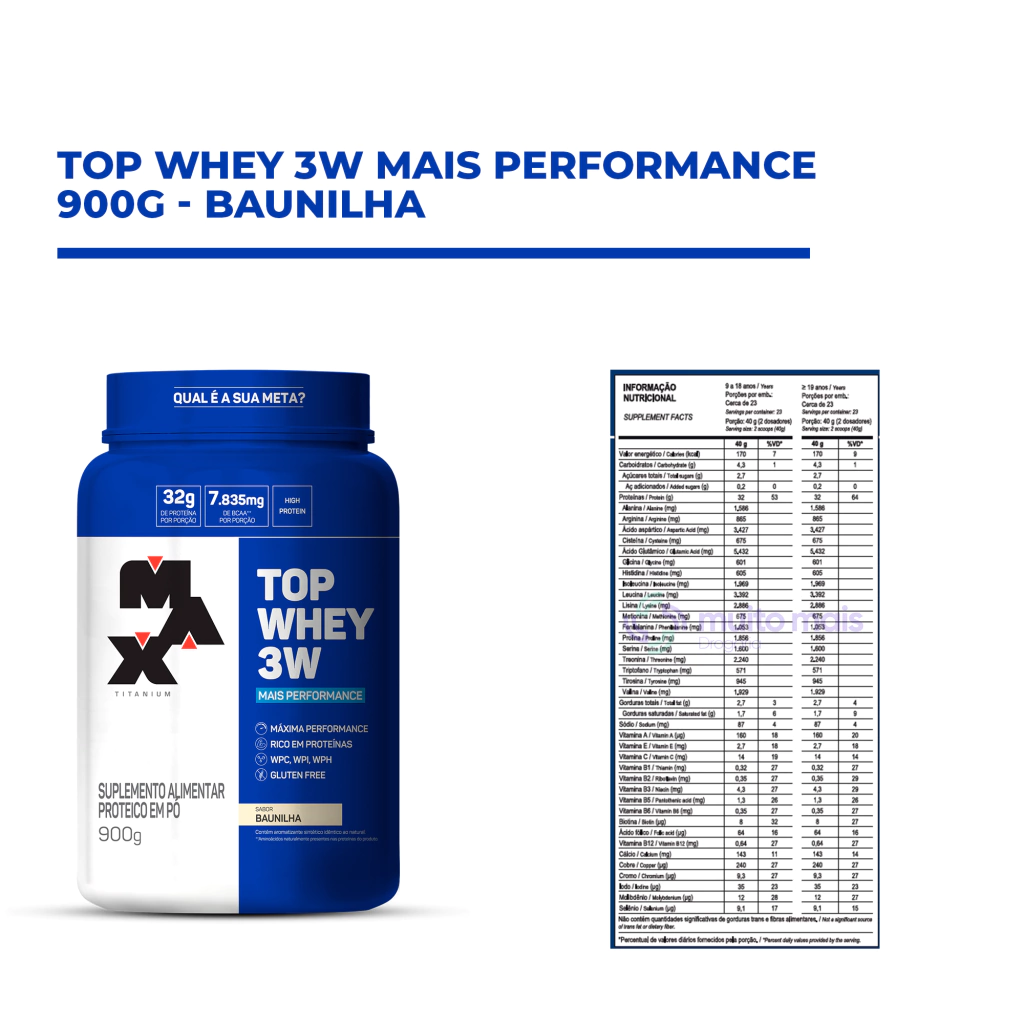 Top Whey 3W Max Titanium combina as três formas de proteína do soro do leite (WPC, WPI e WPH) em uma formulação de alta qualidade. A linha Mais Performance oferece: