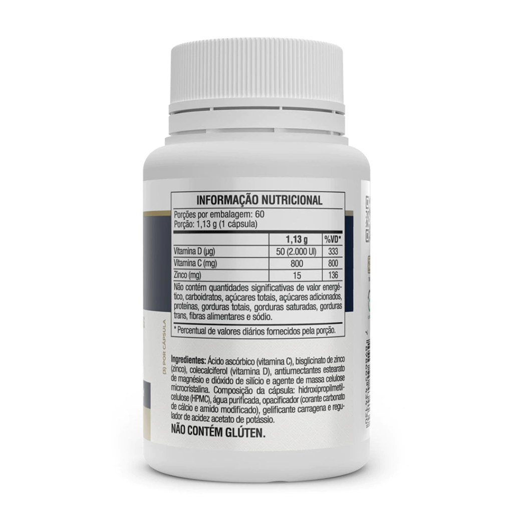Ácido ascórbico (vitamina C), bisglicinato de zinco (zinco), colecalciferol (vitamina D), antiumectantes estearato de magnésio e dióxido de silício e agente de massa cellulose microcristalina.